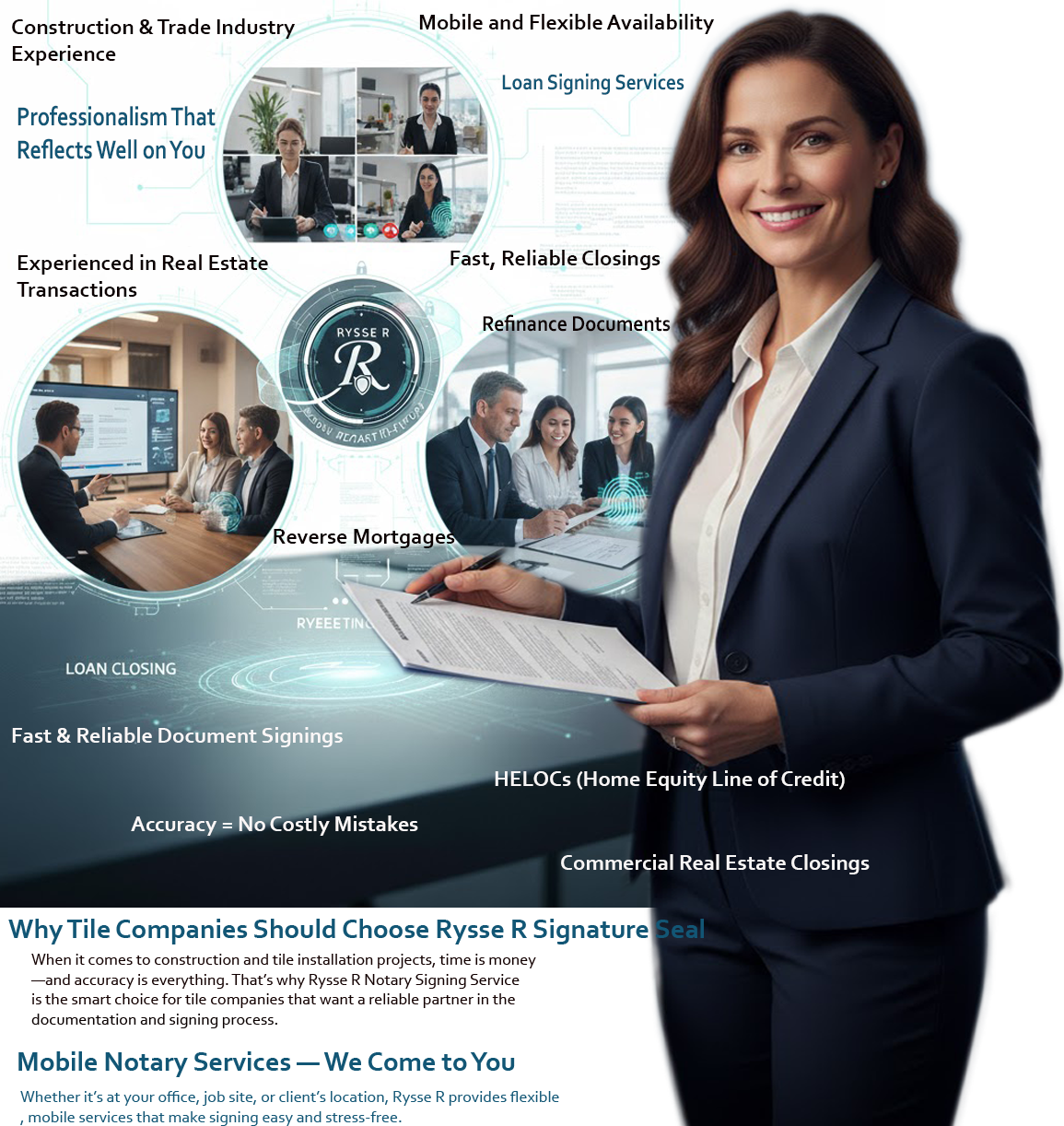 For title companies, mortgage lenders, and legal professionals, Rysse R Signature Seal offers unparalleled efficiency and security in document notarization. We don't just notarize documents; we deliver peace of mind. Leverage our vast network of vetted Notary Signing Agents and cutting-edge technology to streamline your operations.